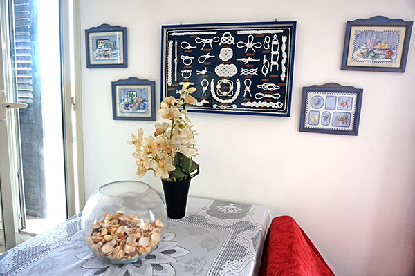 The combined kitchen-dining-living room is rather spacious and opens onto the terrace. The kitchen-dining area (incl. 4-burner gas stove, refrigerator with freezer compartment, microwave, capsule coffee machine) lies to the one side; to the other side lies the living area with a cozy sofa corner, TV and radio.